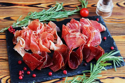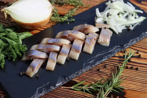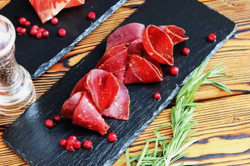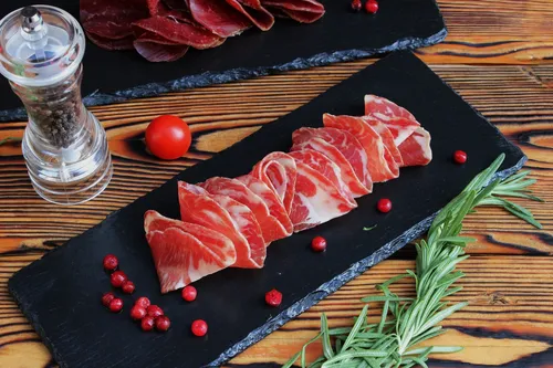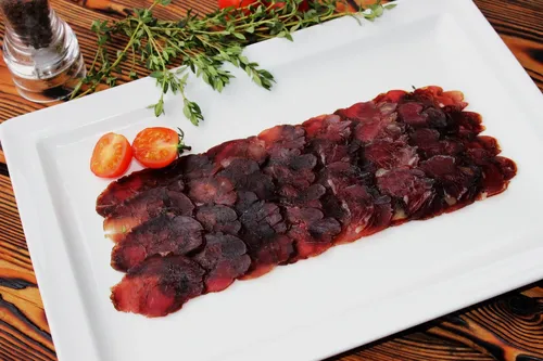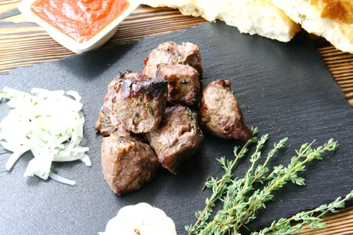 Телячья вырезка, маринованная в пряных травах. Подается с маринованным луком и томатным соусом. Вес 100 г.