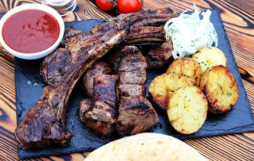 Каре баранины 3 ребра, шашлык из телятины (300 гр.) картофель с маслом 1 порция, лепешка, лук маринованный, соус томатный