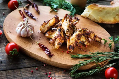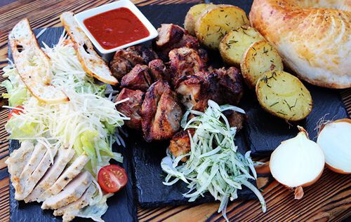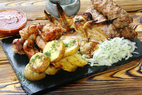 Шашлык из свиной шеи (300 г), люля кебаб (300 г), куриные крылышки (300 г), картофель со сливочным маслом (200 г), подается с маринованным луком и томатным соусом. Вес блюда 1100 г.