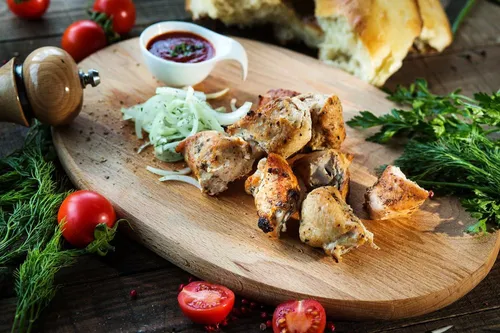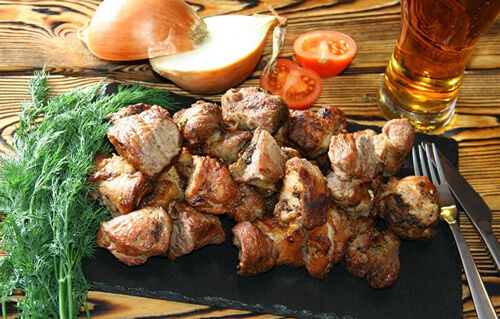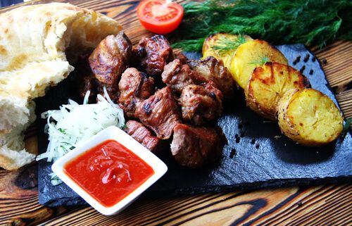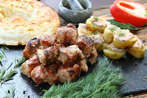 Шашлык из свиной шеи (500 гр.), картофель со сливочным маслом(200 гр.), подается с узбекской лепешкой, маринованным луком и томатным соусом. Вес блюда 700 г.