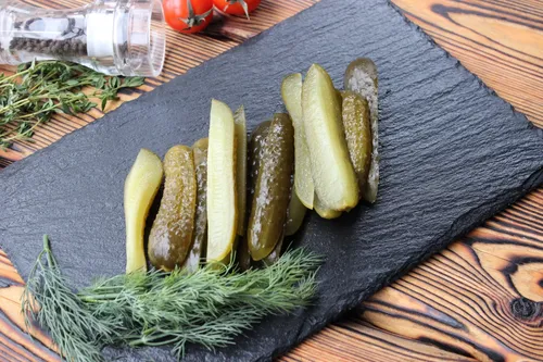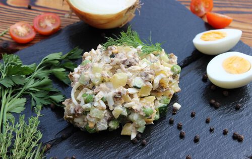 Телятина, бочковые огурцы, свежие огурцы, картофель, майонез, зелёный горошек, куриное яйцо. Вес 220 г.