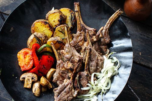 Каре баранины с овощами гриль и печеным картофелем со сливочным маслом, подается с узбекской лепешкой, томатным соусом и маринованным луком. Сет на 2 чел. 6 рёбр. Вес блюда 750 г.