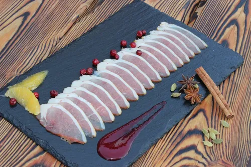 Подается с филе апельсина, пряным брусничным соусом с добавлением гречишного мёда