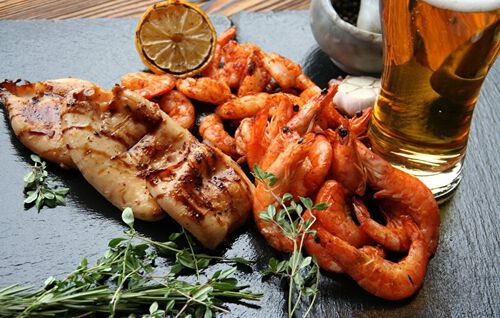 Кальмары (200 г), королевские креветки (120 г), тигровые креветки (120 г). Вес блюда 440 г.