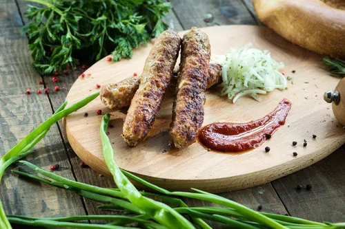 подается с маринованным луком и томатным соусом. Вес 100 г.