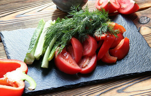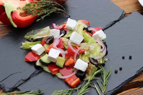 Томаты, перец болгарский, огурцы, салат айсберг, маслины, красный лук, сыр сиртаки, оливковое масло. Вес 190 г.