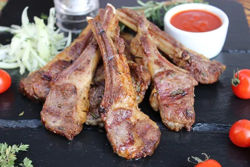 Каре баранины 3 ребра. Подается с маринованным луком и томатным соусом. Вес ~250 г.