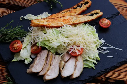 Салат айсберг, куриное бедро, пармезан, пшеничные гренки, черри. Вес 200 г.