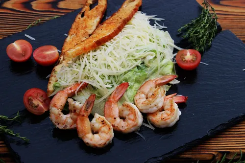Салат айсберг, креветки тигровые, пармезан, пшеничные гренки, черри. Вес 200 г.